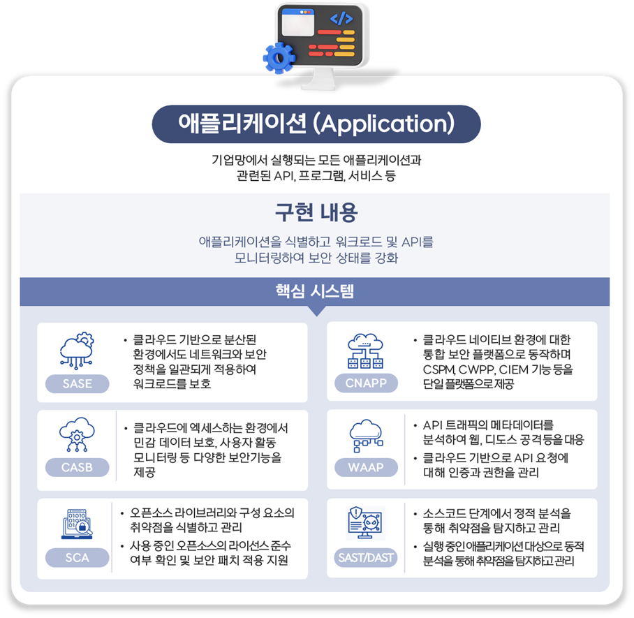 애플리케이션 및 워크로드 필러에서 제로트러스트 아키텍처의 원칙을 실제로 구현하기 위해 다양한 시스템을 통합적으로 운영해야 합니다. SASE, CNAPP, CASB, WAAP 등은 각각 독립적인 역할을 수행할 뿐 아니라, 상호 연계되어 다양한 환경의 어플리케이션 및 워크로드 필러에 대한 통합 관리 방안을 제공합니다.