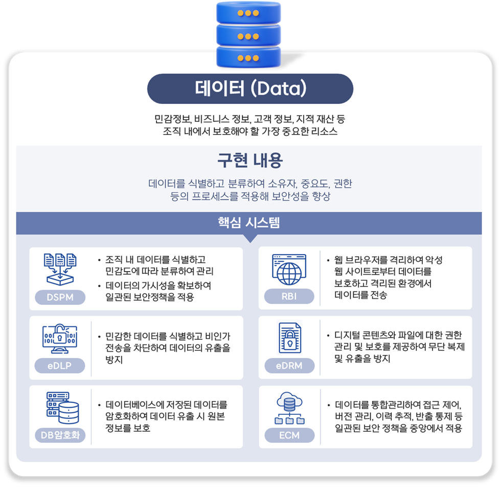 데이터 필러에서 제로트러스트 아키텍처의 원칙을 실제로 구현하기 위해 다양한 시스템을 통합적으로 운영해야 합니다. DSPM, eDLP, eDRM, ECM 등은 각각 독립적인 역할을 수행할 뿐 아니라, 상호 연계되어 다양한 환경의 어플리케이션 및 워크로드 필러에 대한 통합 관리 방안을 제공합니다.