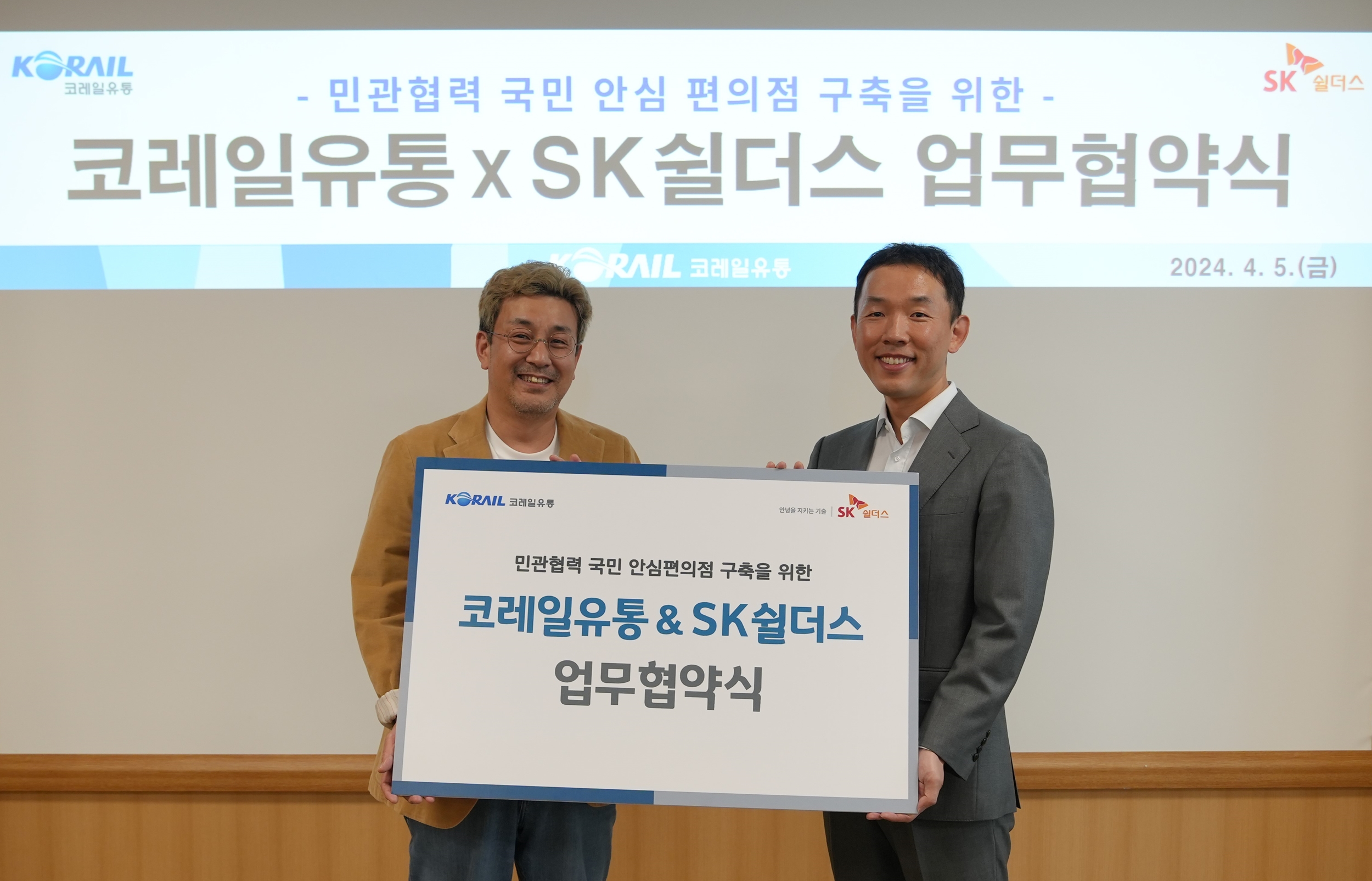 △ 지난 5일 서울 영등포구 코레일유통 본사에서 SK쉴더스와 코레일유통이 국민안심편의점 구축을 위한 업무 협약을 체결했다. SK쉴더스 장웅준 부사장(오른쪽)과 코레일유통 김영태 대표(왼쪽)가 기념 촬영을 하고 있다.