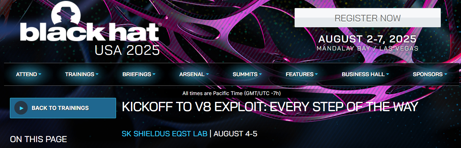 웹 브라우저는 가장 널리 쓰이는 애플리케이션 중 하나로, 사용자 편의를 위해 다양한 기능과 권한을 갖추게 되면서 공격자들의 주요 침투 경로가 되었습니다. 특히, 전 세계적으로 가장 많은 사용자를 보유한 구글 크롬과 그 핵심 엔진인 Chrome V8은 대표적인 공격 대상이 되고 있습니다. Chrome V8은 JavaScript 실행을 담당하는 고성능 엔진으로, 성능을 높이는 과정에서 힙 메모리 처리와 관련된 복잡한 로직이 필연적으로 보안 취약점을 유발할 수 있습니다. 이처럼 복잡하고 동적인 구조를 가진 엔진은 성능과 보안 사이에서 끊임없는 균형 조정이 요구되며, 이로 인해 잠재적인 취약점 발생 가능성은 항상 존재합니다. 엔진에 대한 정확한 이해와 취약점 분석 능력은 곧 브라우저 보안의 핵심 역량이라 해도 과언이 아닌데요. 이에 SK쉴더스 EQST가 세계 최대 해킹 콘퍼런스인 Black Hat USA 2025에서 실전 중심의 Chrome V8 익스플로잇 실습 교육을 개최합니다.