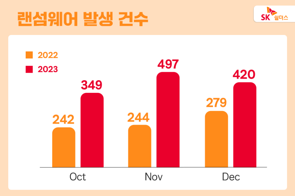 실제로 2023년 4분기 KARA 랜섬웨어 동향 보고서에 따르면, 23년 4분기 랜섬웨어 공격 피해 발생 건수는 전년 동기 대비 65.4%으로 무려 1,266건이 증가했는데요.