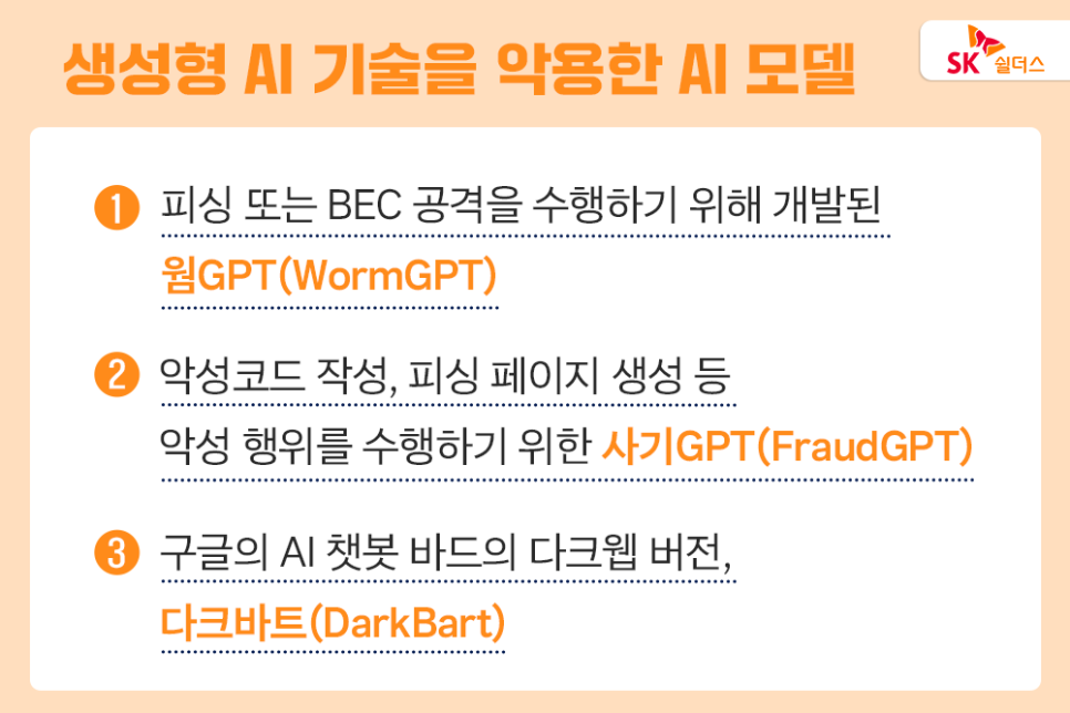 챗GPT 악용 범죄가 늘어나면서 이를 지칭하는 용어까지 등장했습니다. 피싱이나 BEC[1]공격을 수행하기 위한 목적으로 개발된 AI 모델은 ‘웜GPT(WormGPT)’, 악성코드를 작성하고 피싱 페이지를 생성하는 등의 악성행위를 수행하기 위한 목적으로 개발된 AI 모델은 ‘사기GPT(FraudGPT)’로 불립니다.
