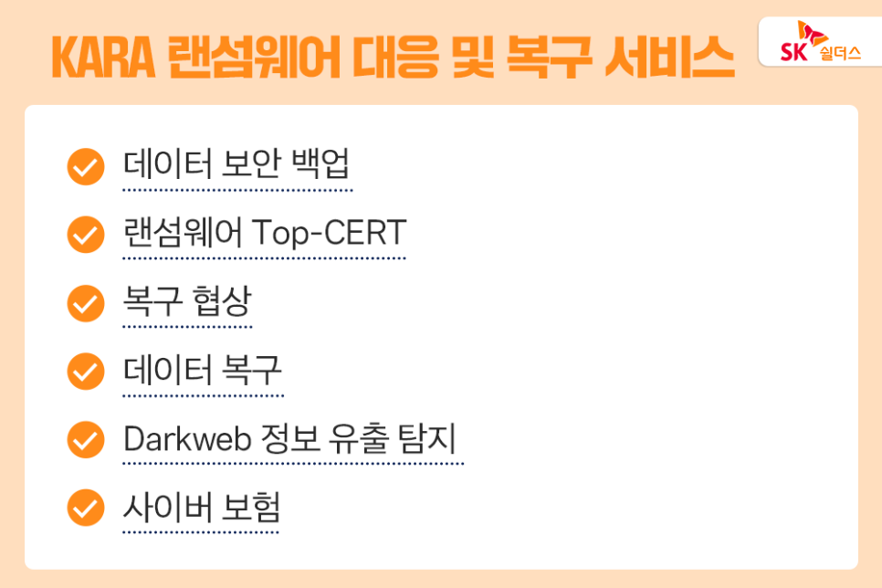 만약 랜섬웨어 공격으로 인한 해킹 사고가 이미 발생했다면 어떻게 대응해야 할까요? 사고 발생 시 빠른 신고를 통해 문제를 파악하고 대응하는 것이 중요합니다. 유관 기관에 빠르게 알리고 전문 기업의 도움을 받는 것이 필요한데요. SK쉴더스가 운영하는 민간 랜섬웨어 대응 협의체 카라(KARA)는 시스템 포맷, 재설치 등 사고 수습은 물론, 정확한 사고 분석을 시작으로 근본적인 해결이 가능하도록 지원하고 있습니다.