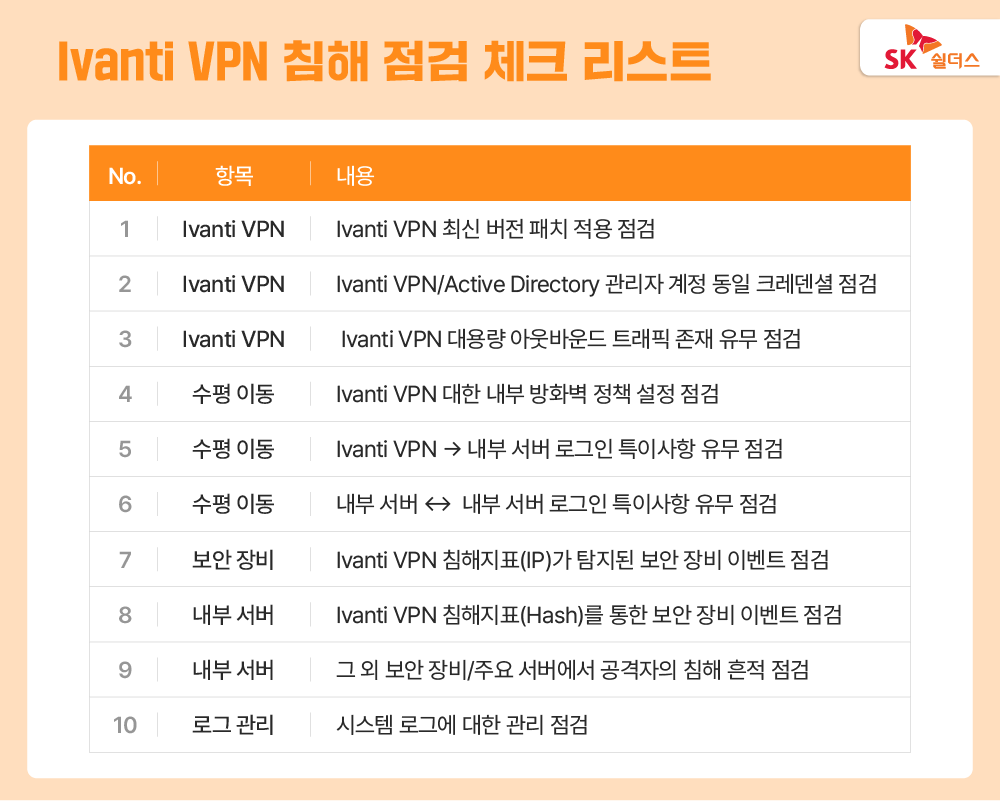 Ivanti VPN은 지난 1월부터 발견된 취약점이 지속적으로 발견되고 있어 철저한 모니터링 및 관리가 필요합니다. 보안 패치를 적용하거나 개발하는 과정에서 공격을 시도하는 해커를 대비해 지속적인 모니터링은 물론, 침투 여부를 반드시 점검해야 하는데요. Top-CERT는 기업과 기관에서 해킹 피해를 직접 점검할 수 있도록 침해사고 및 흔적 점검에 베이스로 사용한 점검 체크 리스트를 단계별로 제시했습니다.