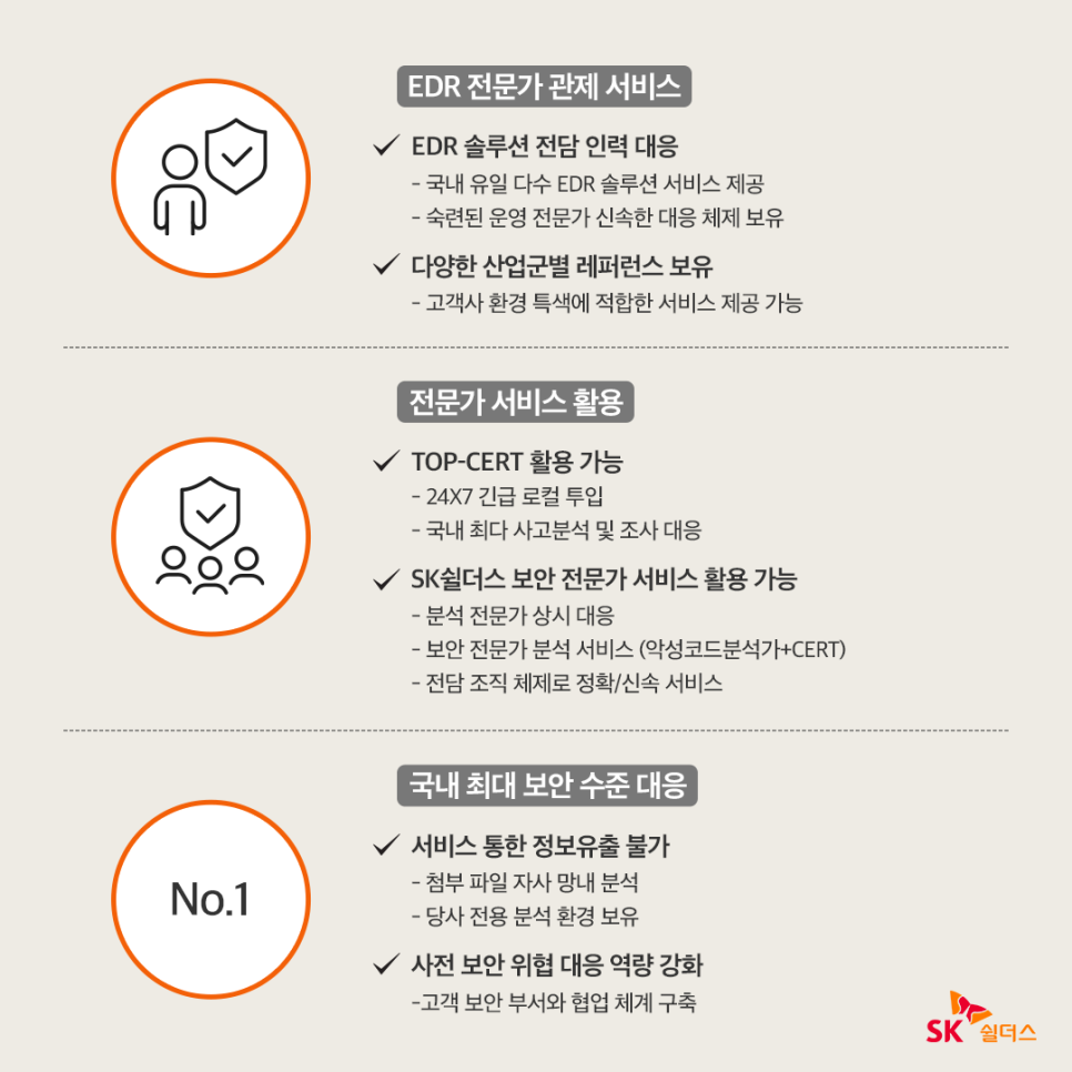 보안 위협을 실시간으로 감지해 위협을 사전에 차단하는 것이 주요 특징이지만, 전문가의 분석 능력이 뒷받침되는 것이 매우 중요한데요, SK쉴더스는 그간 축적해온 독보적인 보안 역량을 바탕으로 EDR 특화 위협 탐지 대응 MDR 서비스를 구축했습니다.