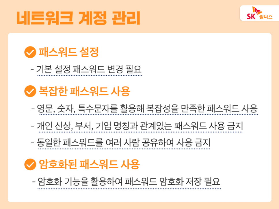 첫째, 네트워크 계정 관리가 중요합니다. 패스워드가 없거나, 기본 패스워드를 사용하거나 패스워드가 평문일 경우, 관리자 계정의 탈취위험이 높아지는데요. 크리덴셜 스터핑 공격 시 정보를 쉽게 탈취할 수 없도록 암호를 설정하고, 암호 저장 관리에도 유의해 해킹 공격에 1차적으로 대비할 수 있습니다.