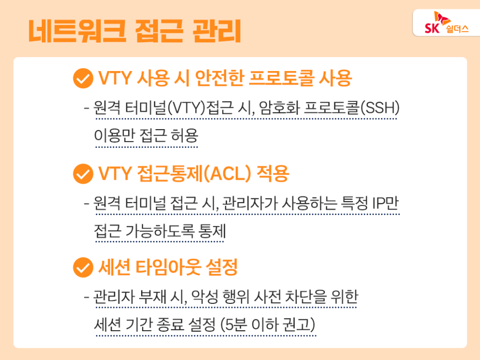 더불어 원격 터미널(VTY)에 접근을 제한하는 ACL(Access Control List)정책을 적용해 관리자가 사용하는 특정 IP만 접근 가능하도록 통제하고, 5분 이하의 세션 타임아웃 시간을 설정해 관리자 부재 시 발생할 수 있는 위험을 차단하는 것이 좋습니다.