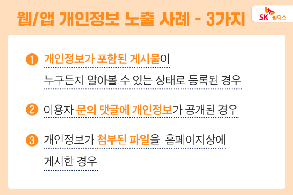 개인정보는 오프라인보다 쉽게 접근할 수 있는 공개된 앱(App) 또는 웹(Web) 서비스에서는 유출 사고가 더욱 빈번히 일어날 수 있는데요. 꼭 해킹이나 랜섬웨어와 같은 외부 자극 없이도 자주 발생하는 피해 사례를 알아볼까요? 👇