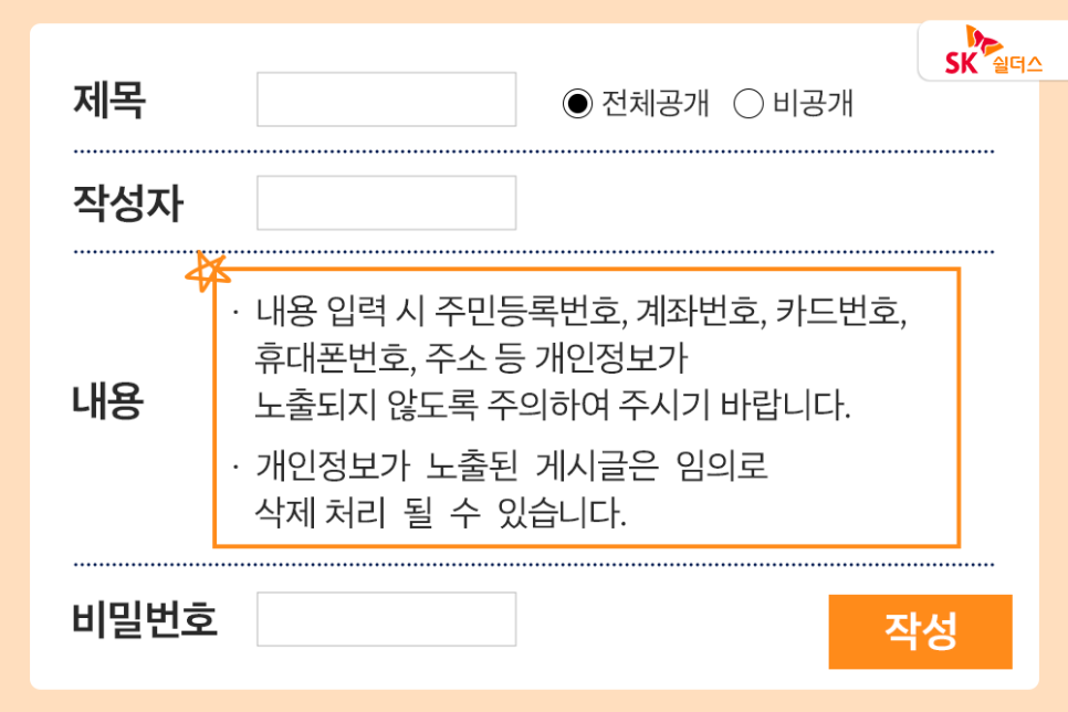 · 서비스 이용자가 게시판 등을 이용할 때, 특정 문구를 통해 개인정보 노출 예방에 대한 안내를 받을 수 있도록 합니다.
