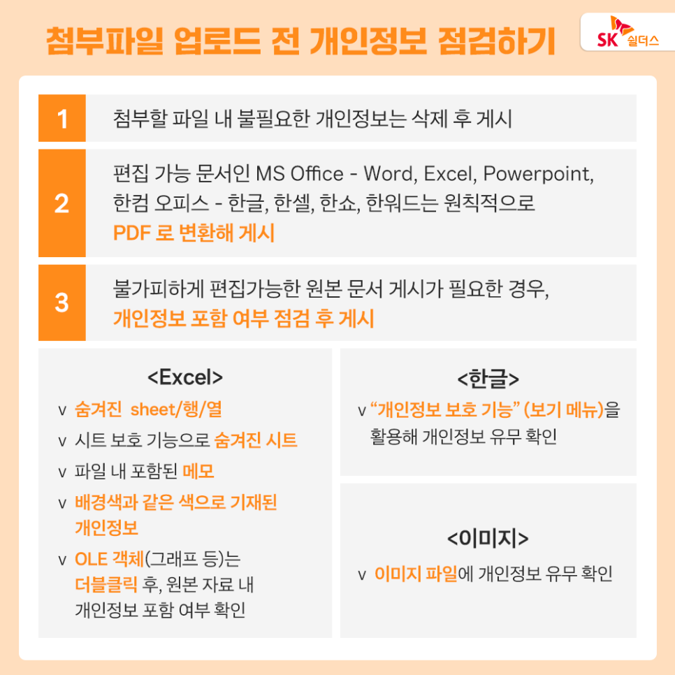 · 서비스 내 첨부파일이 포함된 게시물 등록 전 다음의 개인정보 포함 여부를 점검합니다.