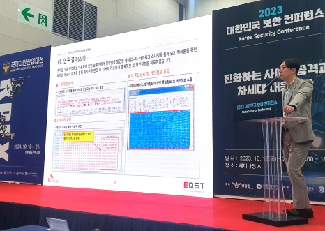 <2023 대한민국 보안 컨퍼런스>에서 발표를 하고 있는 EQST Lab 이호석 이사