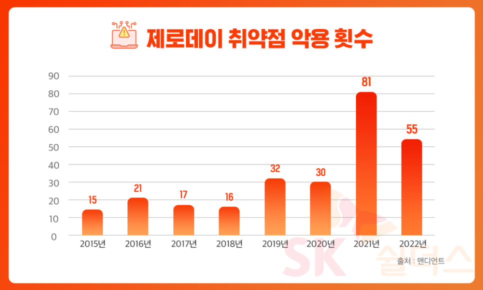 제로데이 공격은 알려지지 않은 보안 취약점을 이용한 공격을 의미합니다. 지피지기면 백전불패라는 말이 있듯, 이와 반대로 취약점에 대한 정보가 없다면 공격을 인지하기 어렵기 때문에 심각한 피해를 입을 수 있습니다. 이러한 취약점을 악용하는 사례는 2015년부터 꾸준히 증가하고 있는 추세인데요.